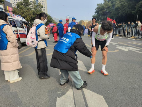 比赛当天,志愿者们身着统一的志愿服装,佩戴醒目的标识,清晨六点半便已集结完毕,乘坐比赛专用护送车,提前到达赛道沿线、起终点处和赛后恢复区等指定位置。赛程中,他们分工合作,在各自的岗位上,密切关注着参赛选手的身体状况,一旦发现有选手出现身体不适,如抽筋、脱水或者更严重的体力透支等情况,志愿者们都会第一时间上前询问、检查,并协助医护人员对受伤选手进行救助。在赛后拉伸区域,志愿者们两两一组,分工明确,耐心地引导选手进行拉伸放松,帮助他们迅速恢复体力。